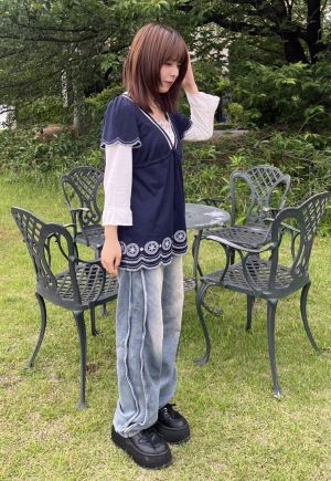 「フリルのレイヤードでガーリーに、デニムを合わせて甘辛コーデを意識したスタイル。 袖と胸元の刺繍が同じデザインになる組み合わせです。」