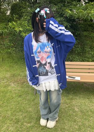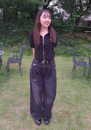 「どこを切り取っても退屈にさせない様にフリルを用いたり、色合いを少し変えてみたり工夫しました。 ポイントは、Tシャツとヘアピンです。 Tシャツは自分で描いたイラストです。自分の好きな水色を沢山とり入れました。 ヘアピンは、派手可愛いをコンセプトに、持ってるピンを全て取り入れました。」