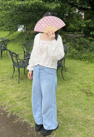 「暗い色を入れずにナチュラルでリラックスした雰囲気に。白の花柄レースパーカーを取り入れて、清潔感を意識しました。 花柄と花の小物を身に付けて、トップスのレース柄とリンクして統一感を出しました。」