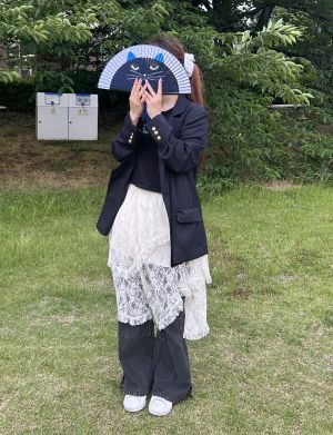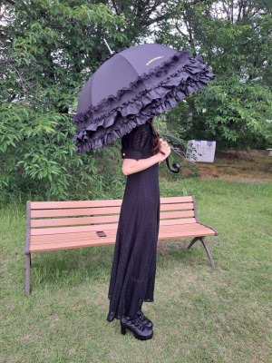 「日傘の色と合うように、全身黒色のアイテムを使ってコーディネートにしました。日傘のレースと合うようにレースの綺麗なワンピースにしました。 日傘のフォルムがとてもお気に入りなので日傘をさしました。」