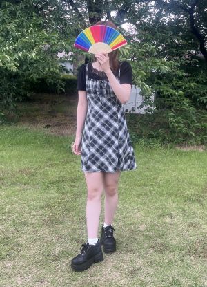 「チェック柄のハイウエストミニスカートでスタイル良く見えるようにしました。 真ん中のリボンで可愛さをあげつつ、厚底でさらにスタイルを盛り、黒で統一しつつちょっと白を入れて明るさをプラスしました。」
