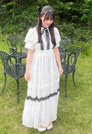 「水玉の夏っぽいロングワンピースを選びました。 胸元にレースでエレガントな感じと首のリボンで上品さ♪ 袖がパフスリーブになっていて可愛らしい雰囲気も♪」