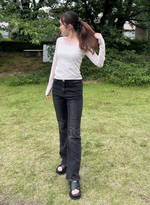 「白のレースとフレアパンツで上品なコーデにしました。 白のレースで透け感と可愛らしさを出しました。」