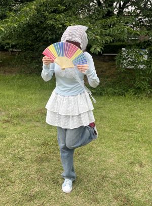 「一番好きな色の水色と流行りのレイヤードやレースを取り入れました。夢に出てきそうなふわふわな雰囲気に仕上げました。 ポイントは、.ヘアスカーフと数字が入っているトップスです。両方とも白いレースで揃えました。」