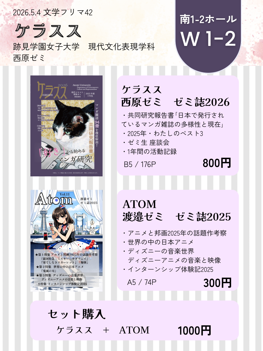 当日は、アニメーション・映像文化研究の渡邉ゼミのゼミ誌『ATOM』も委託販売します。