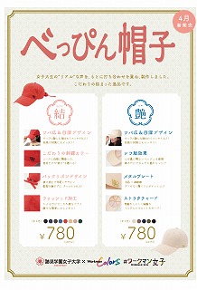 帽子は「べっぴん帽子”結“」と「べっぴん帽子“艶”」の2商品。“結”はバックリボンと刺繍のカラーにこだわりました。“艶”はひと工夫したつば裏のレフ板効果で顔を明るく見せるキャップです。どちらもつば広・目深デザインで、「すっぴんを隠すためにキャップをかぶる」という女子大生の味方です。